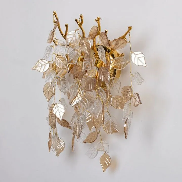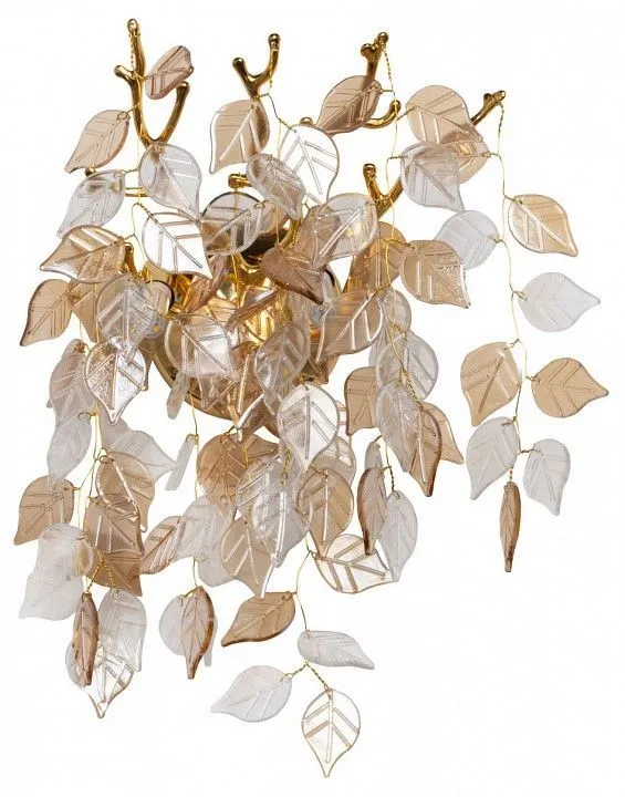 светильник предназначен для использования со скрытой проводкой Основание настенного бра выполнено по технологии художественного литья из сплава алюминия с цинком и гальванизировано в цвет золота. Настенное бра декорировано подвесками из прозрачного и гальванизированного в янтарный цвет стекла в форме листьев.