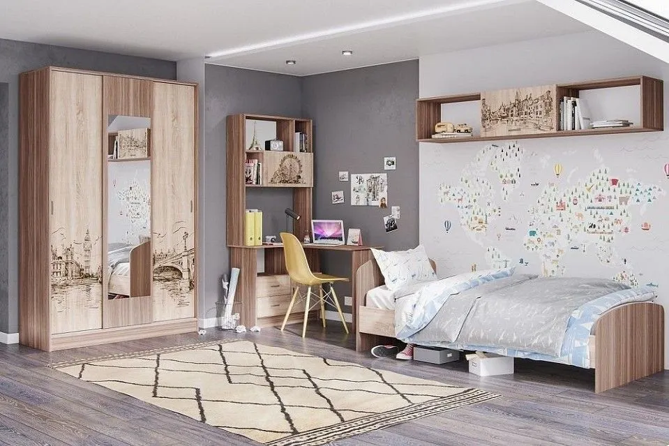 кровать односпальная - 2030х970х750, полка комбинированная - 1940х270х350, стол письменный - 1200х850х1950, шкаф-купе - 1400х540х2200
