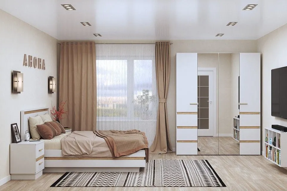 ручки из массива дерева, ящики на шариковых направляющих полного выдвижения, вместительные и глубокие шкафы, все зеркала с фацетом, двуспальная кровать с основанием (металл), матрас приобретается отдельно