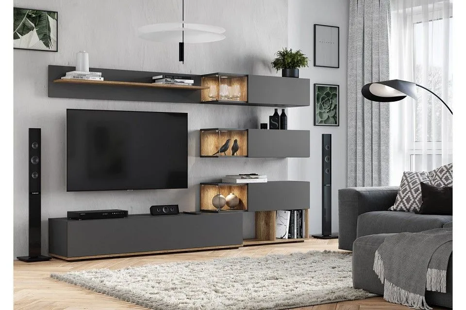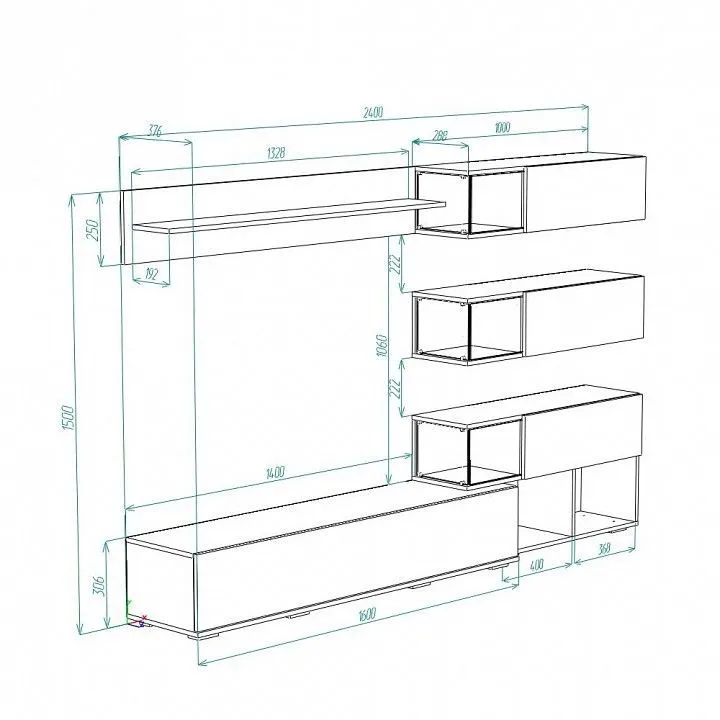 место под ТВ (ШхВхГ) 1400х900х352 мм, ручка - отталкиватель с магнитом, петли створок - накладные, вкладные, газлифт, стекло - 6 мм, еврокромка, опоры - прямоугольная 20 мм, крепление к стене - L-образный навес