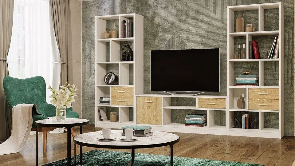 тумба под ТВ - 1600x350x600 мм 2 стеллажа комбинированных - 800x350x2000 мм