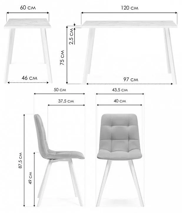 стол обеденный - 1200x600x750 мм 4 стула - 435x500x875 мм