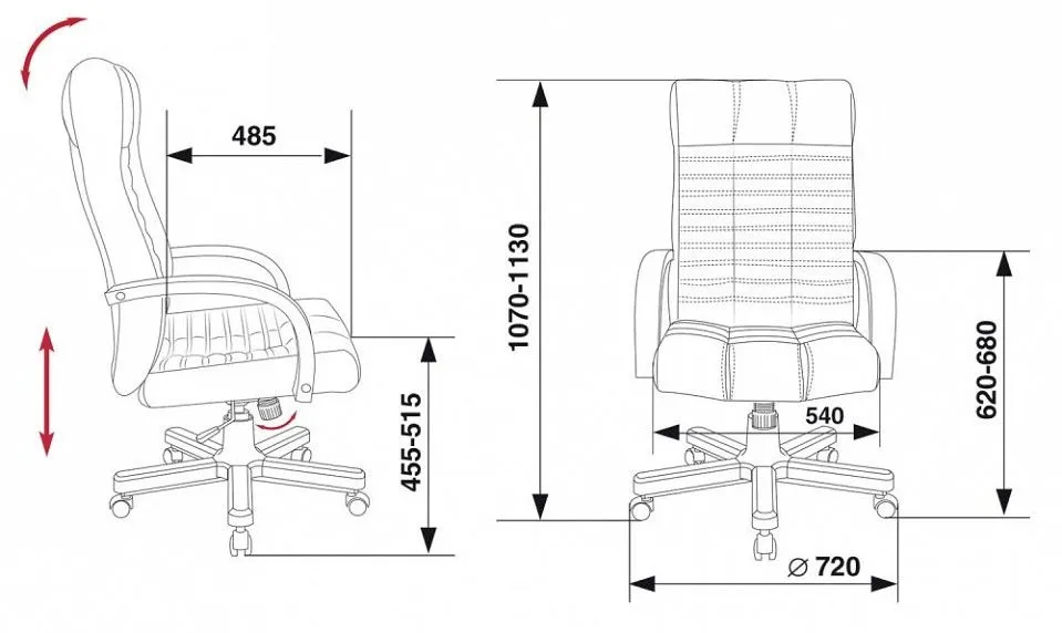высота от пола до подлокотников 620-680 мм, высота от пола до сидения 455-515 мм, диаметр основания - 720 мм