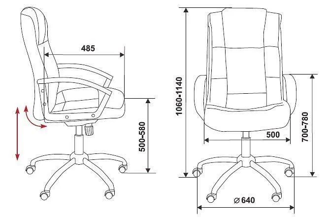 Ширина сиденья - 500 мм. Глубина сиденья - 485 мм. Высота сиденья - 500-580 мм.