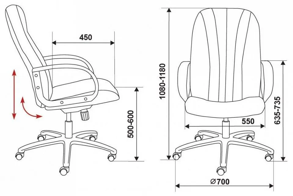 Ширина сиденья - 550 мм, глубина сиденья - 450 мм, высота сиденья - 500-600 мм. Высота подлокотников - 635-735 мм.