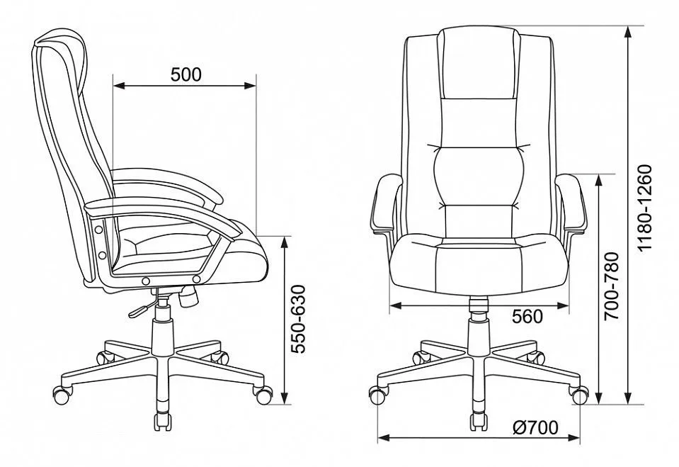 Ширина сиденья - 560 мм. Глубина сиденья - 500 мм. Высота сиденья - 550-630 мм.
