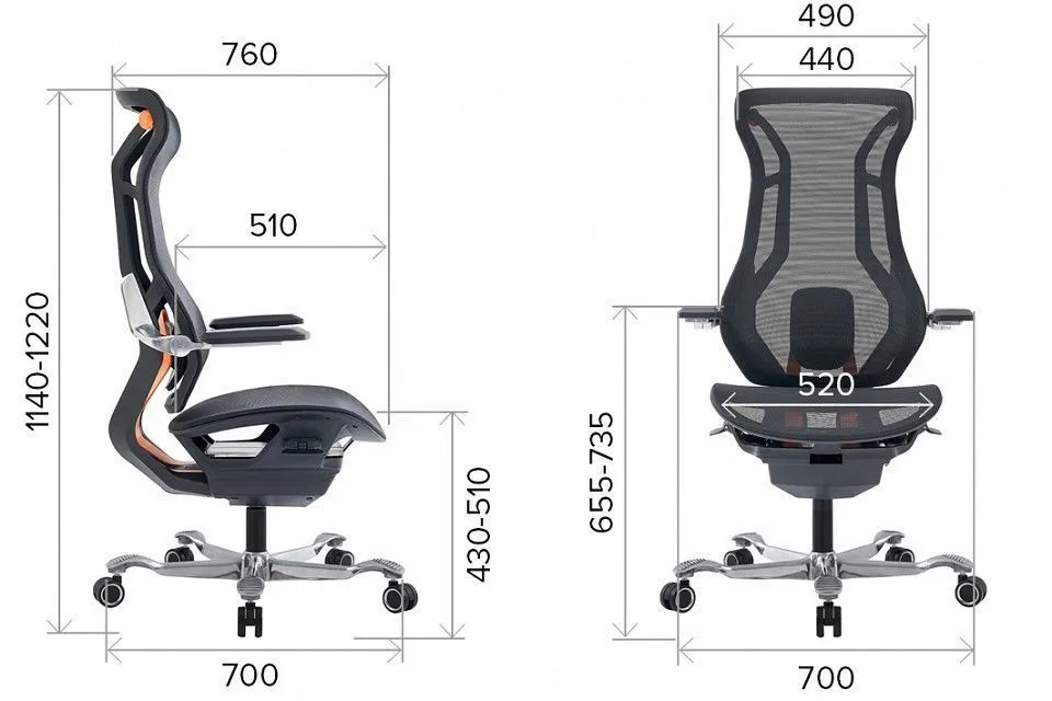 высота сиденья - 430-510 мм, ширина сиденья - 520 мм, глубина сиденья - 510 мм
