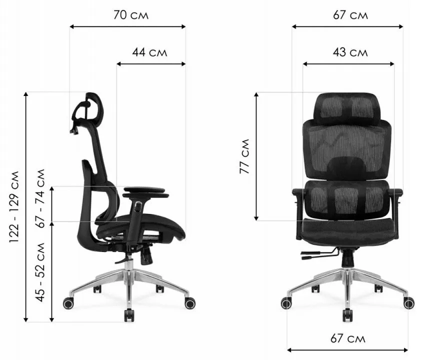 высота от пола до подлокотников - 670-740 мм, высота от пола до сиденья - 450-520 мм, глубина сиденья - 440 мм, диаметр крестовины - 670 мм, ширина сиденья - 430 мм