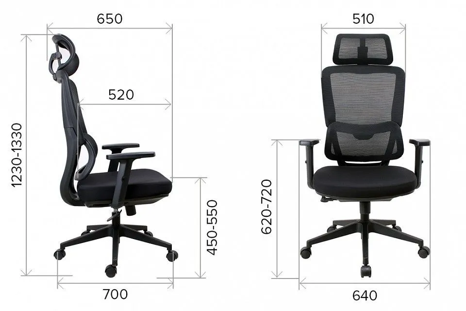 высота сиденья - 450-550 мм, ширина сиденья - 530 мм, глубина сиденья - 520 мм