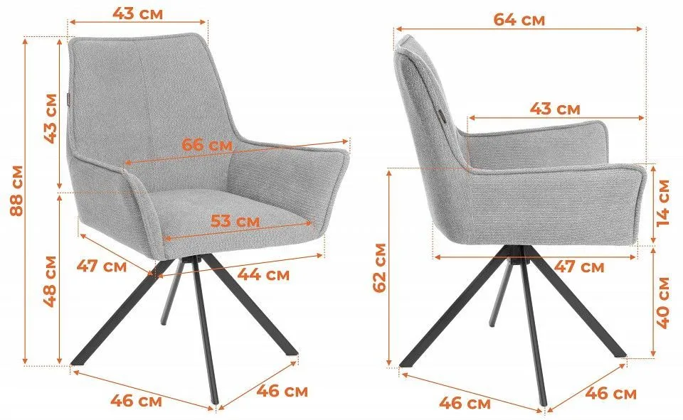 ширина сиденья - 440 мм, глубина сиденья - 430 мм, поворотный механизм 360