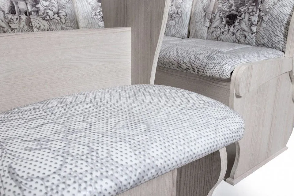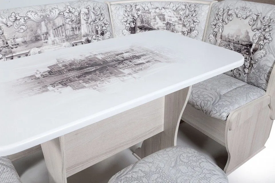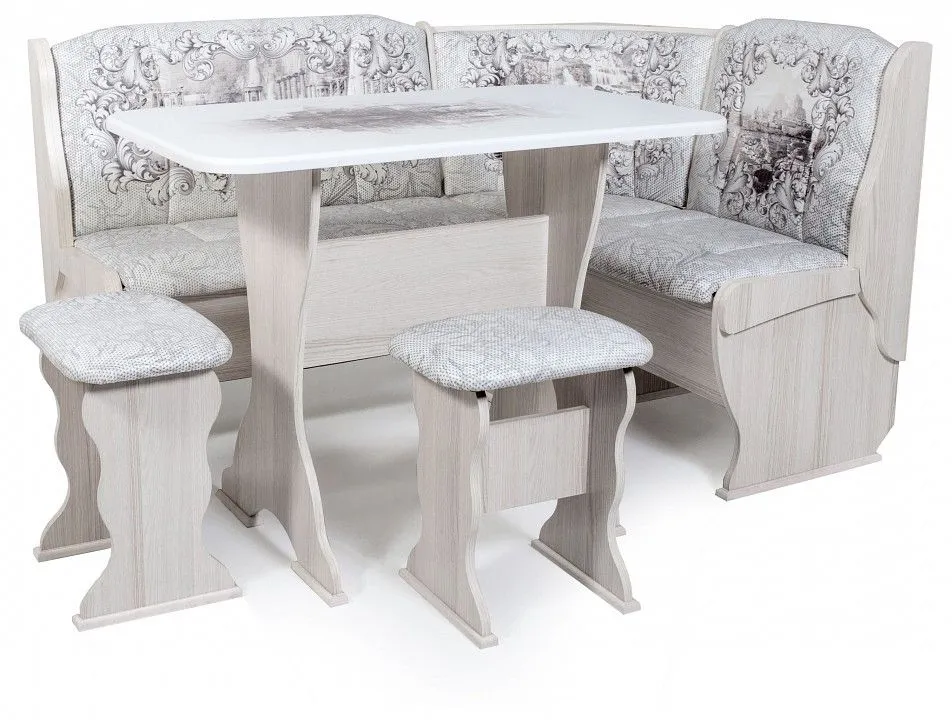 диван - 1500x1100x840 мм, стол обеденный - 1000x580x750 мм, 2 табурета - 300x380x450 мм