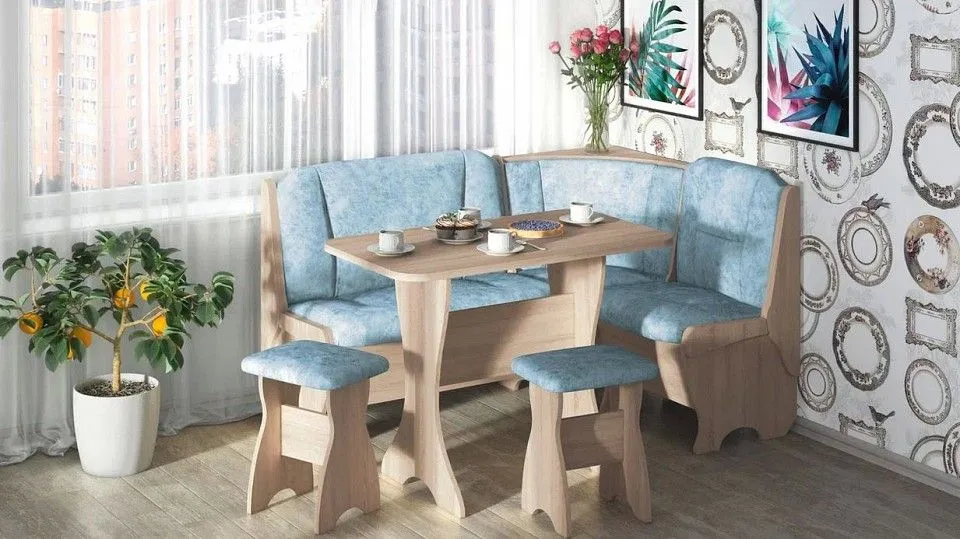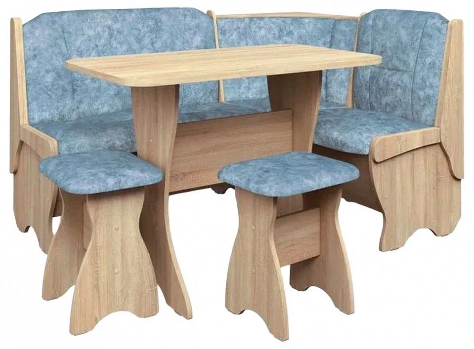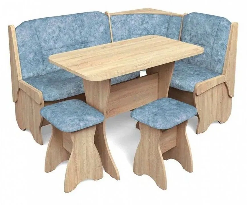 диван - 1500x1100x840 мм, стол обеденный - 1000x580x750 мм, 2 табурета - 300x380x450 мм