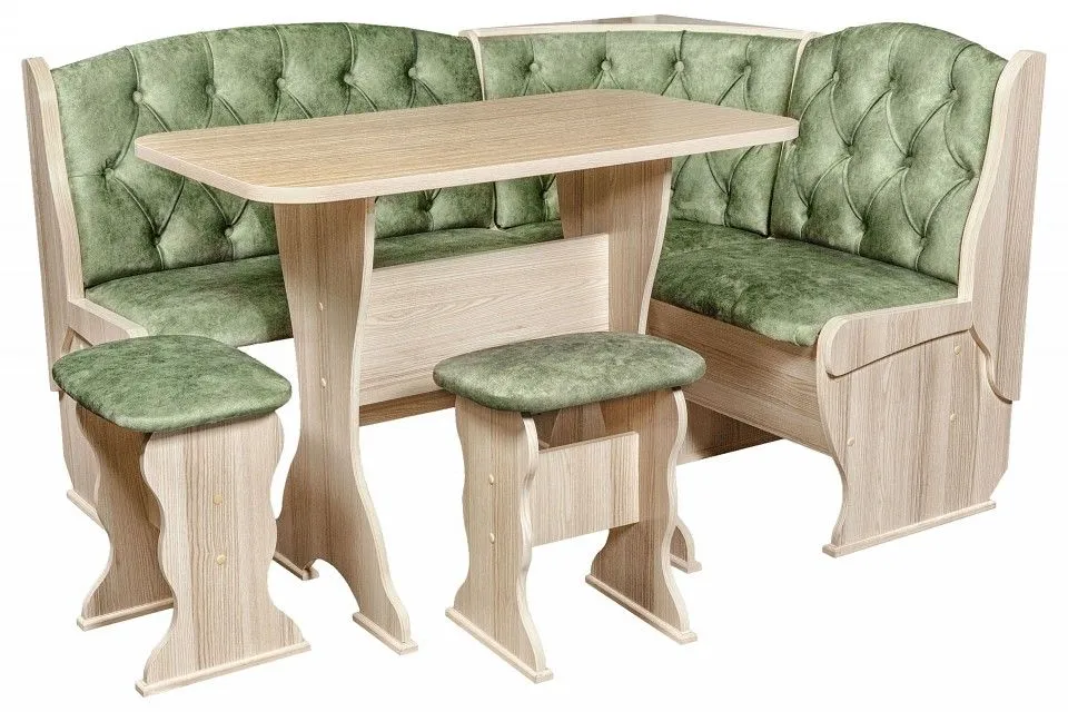 диван - 1500x1100x840 мм, стол обеденный - 1000x580x750 мм, 2 табурета - 300x380x450 мм