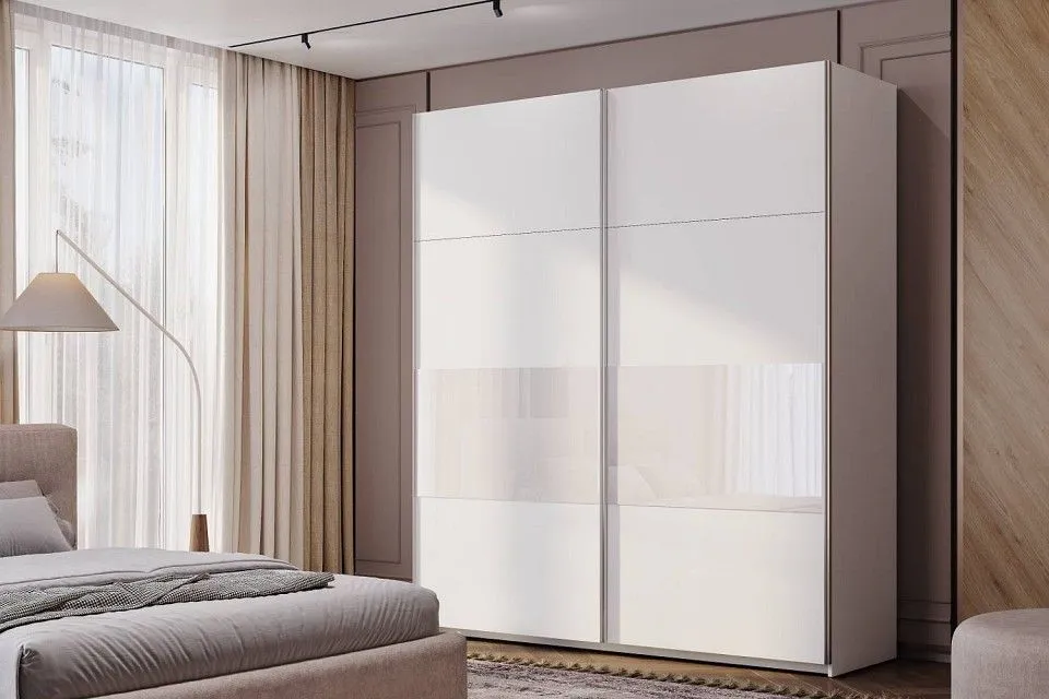 двухдверный фасад из матового стекла, подвесная система фасадов RIAL, обеспечивающая лёгкость открывания дверей, регулируемые подпятники для устойчивости конструкции, четкие линии корпуса и матовый фасад со вставкой из крашенного стекла (лакобель), кромка модели - 0,7 мм