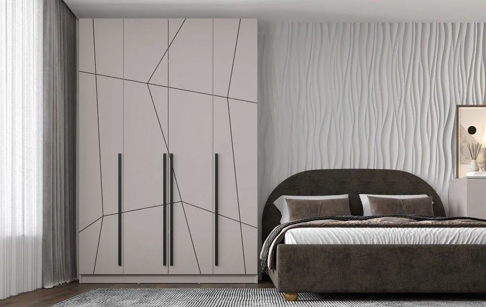 корпус изготовлен из ЛДСП Е1, фасад изготовлен из МДФ с УФ печтью, с геометрической фрезеровкой, ручки - МДФ, опоры - цоколь, петли с доводчиком