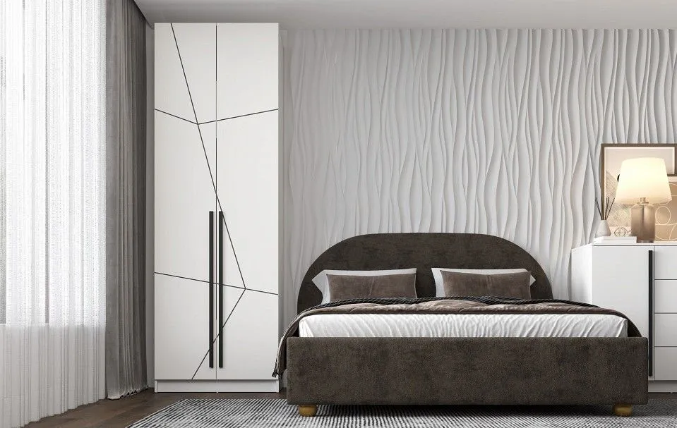 корпус изготовлен из ЛДСП Е1, фасад изготовлен из МДФ с УФ печтью, с геометрической фрезеровкой, ручки - МДФ, опоры - цоколь, петли с доводчиком