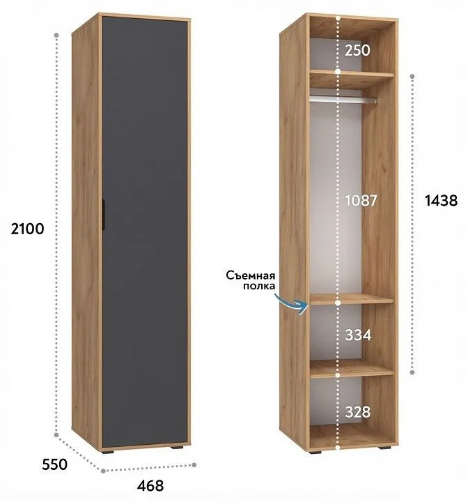 1 дверца, 1 штанга для вешалок, 3 полки