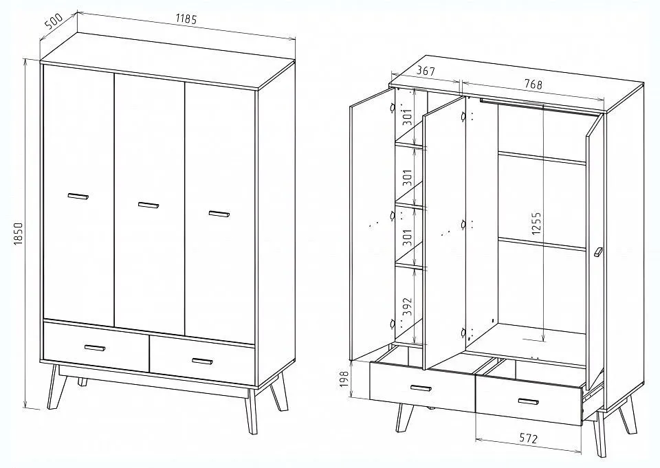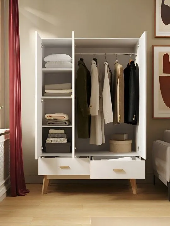 1 штанга для вешалок, 2 ящика, 3 дверцы, 3 полки