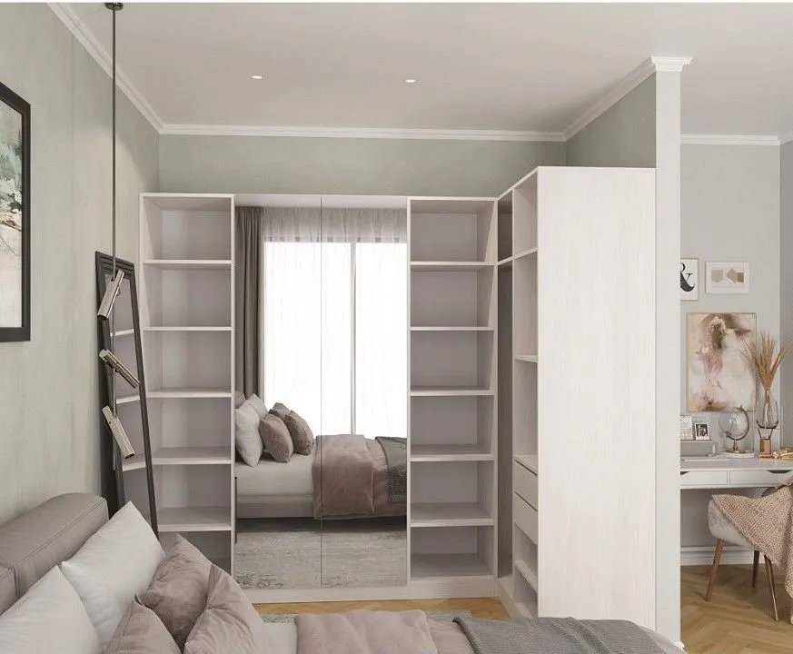 нейтральная палитра - белый, дуб сонома, ясень анкор светлый, распашные фасады - зеркало, металлические ручки, петли с доводчиками, которые обеспечивают бесшумное закрывание дверок , направляющие скрытого монтажа