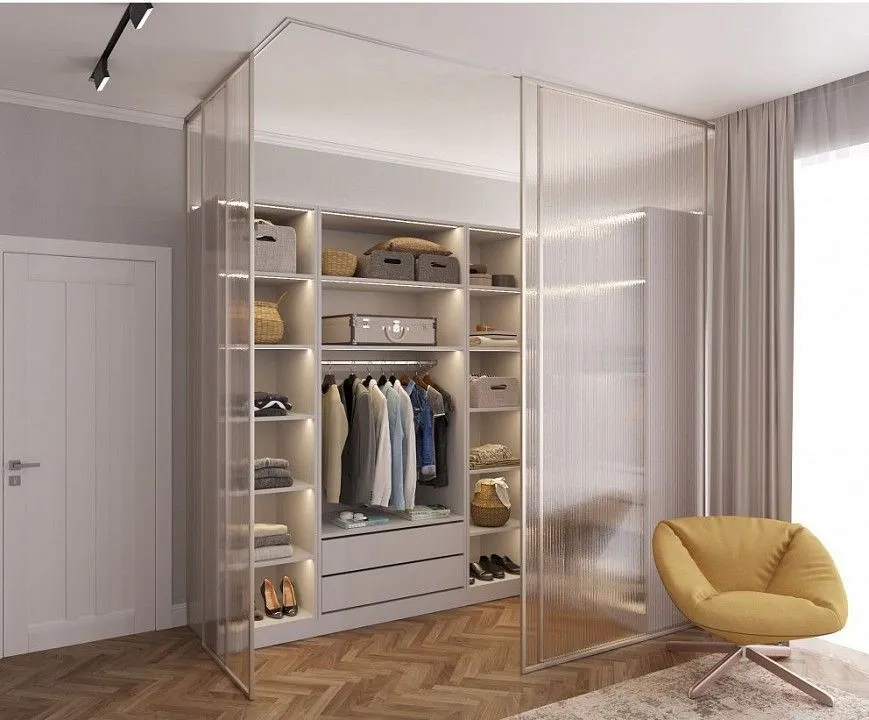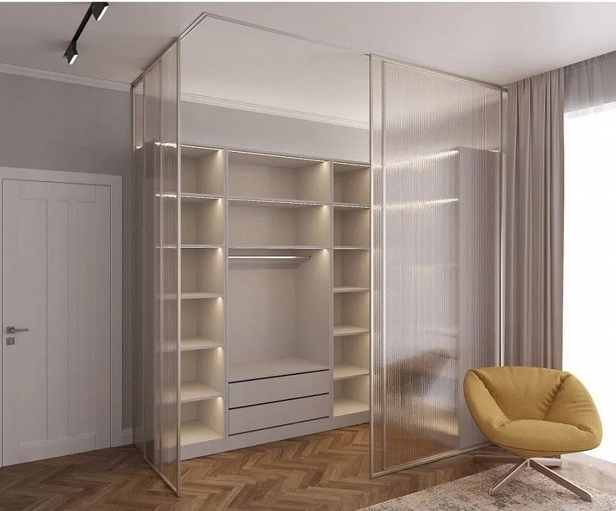 нейтральная палитра - белый, дуб сонома, ясень анкор светлый, можно выбрать 2 варианта распашных фасадов - зеркало и стандарт, направляющие скрытого монтажа