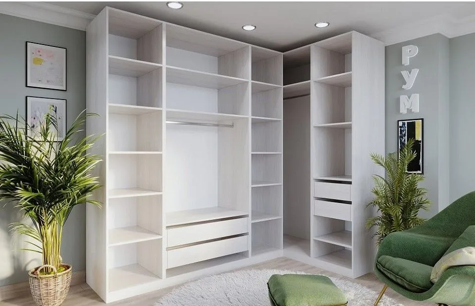 2 шкафа платяных - 1000х580х2360, 2 штанги для вешалок - 968х15х30, 2 ящика - 468х576х160, 2 ящика - 968х576х160, 3 шкафа для белья - 500х580х2360, 4 полки - 968х576х16, 14 полок - 468х576х16