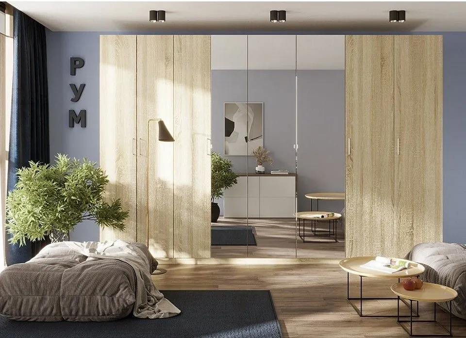 нейтральная палитра - белый, дуб сонома, ясень анкор светлый, 2 варианта распашных фасадов - зеркало и стандарт, металлические ручки, петли с доводчиками, которые обеспечивают бесшумное закрывание дверок, направляющие скрытого монтажа
