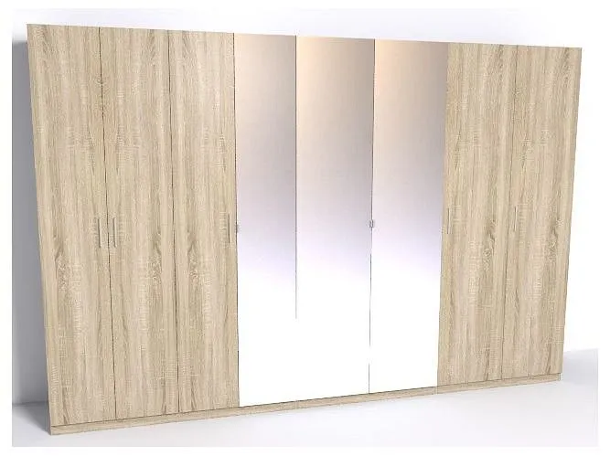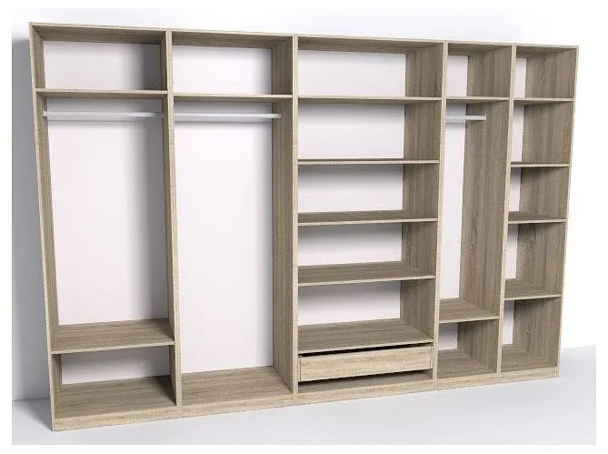 1 шкаф платяной - 1000х580х2360, 1 штанга для вешалок - 468х15х30, 2 шкафа для белья - 500х580х2360, 2 шкафа для белья - 750х580х2360, 2 штанги для вешалок - 718х15х30, 2 ящика - 968х576х160, 4 дверцы - 372х20х2292, 4 дверцы - 497х20х2292, 4 полки - 718х576х16, 6 полок - 968х576х16, 6 полок - 468х576х16