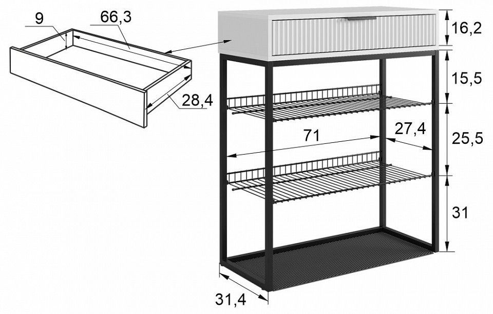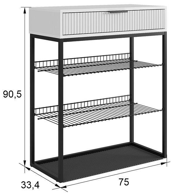 кромка ПВХ 19x1 мм, кромка ПВХ 19x0.4 мм полка сетчатая - 300х695 мм коврик Эва - 712х295 мм максимальная нагрузка на ящик - 15 кг направляющие - шариковые вместимость - до 9 пар обуви