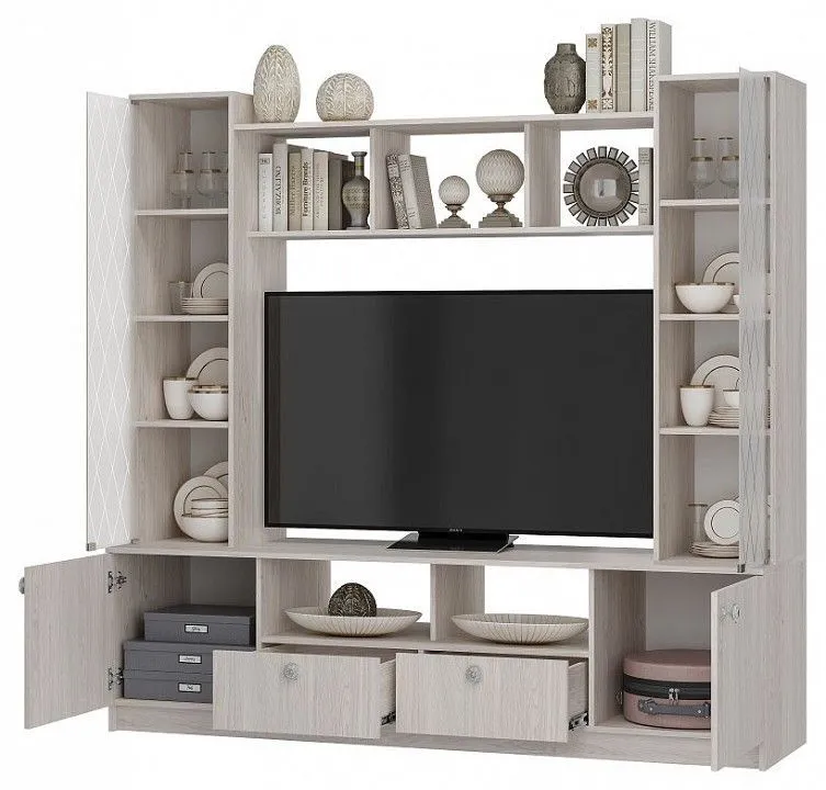 декорированные рисунком стеклянные створки, ШГВ ниши под ТВ, см - 130х53.2х92.8, шариковые направляющие полного, плавного и бесшумного выдвижения на ящиках, элегантные ручки оригинальной формы