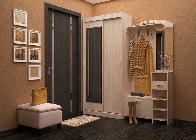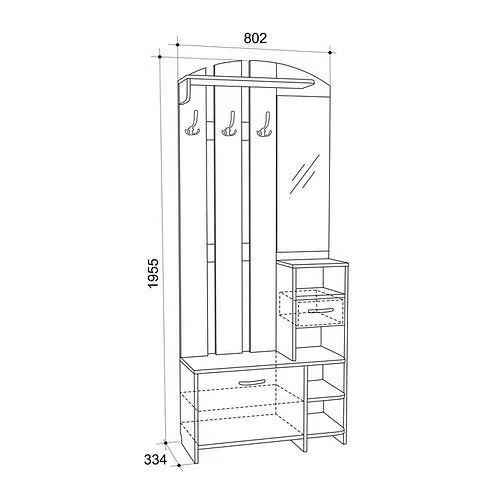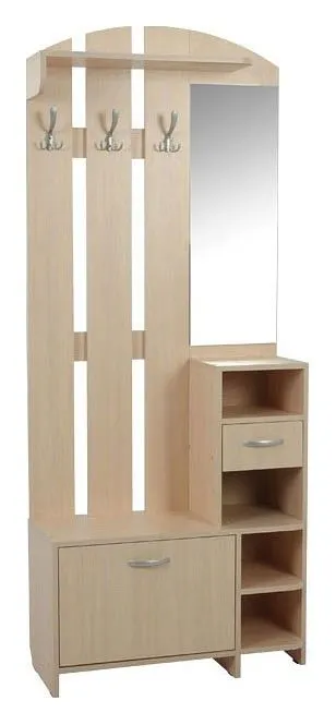 вешалка:, 1 полка, 3 крючка; зеркало; стеллаж:, 1 ящик, 2 полки; тумба для обуви:, 1 дверца, 1 полка