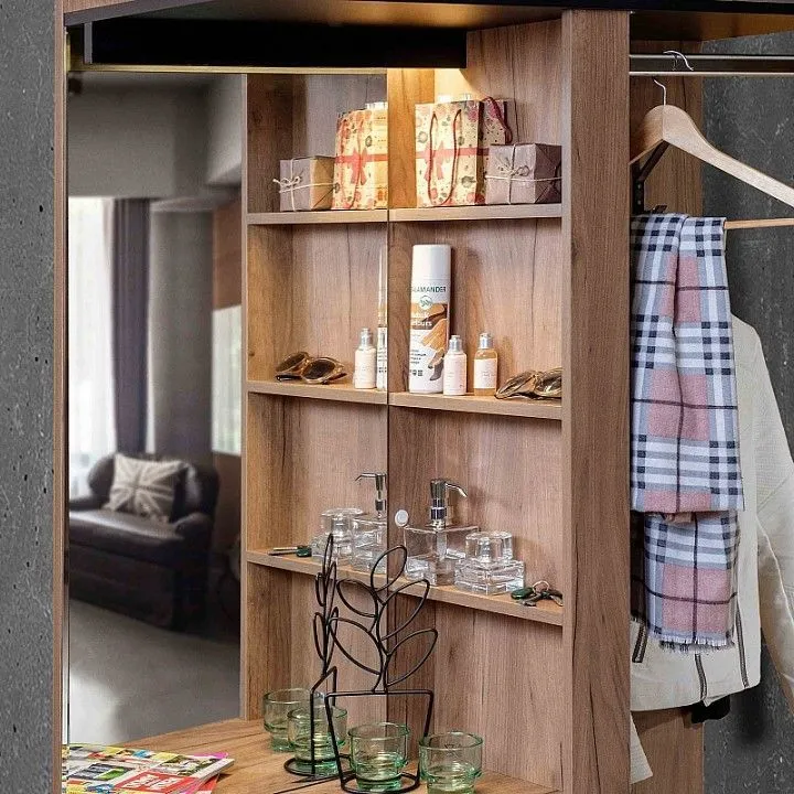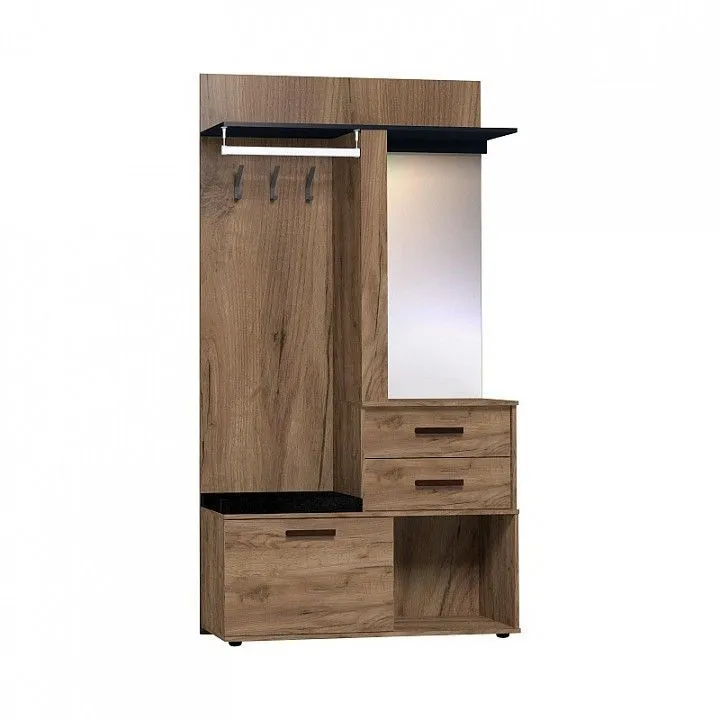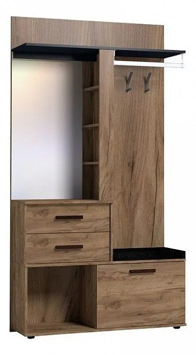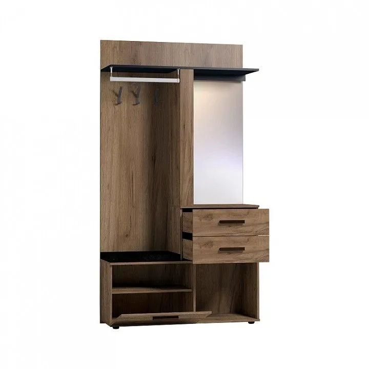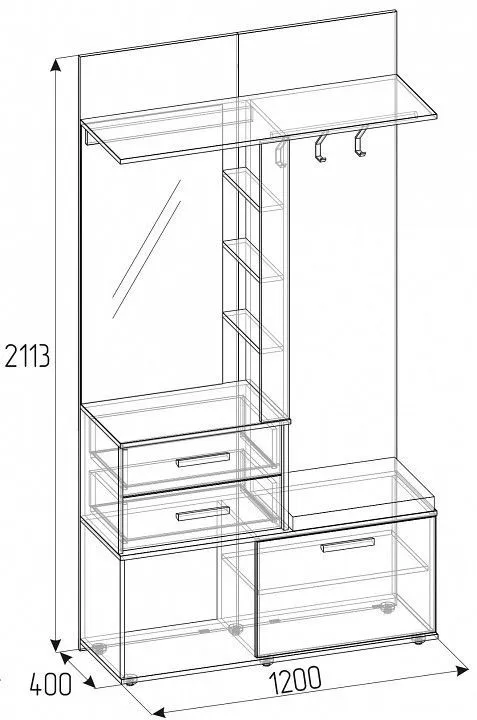 зеркало, 1 дверца, 1 полка, 1 штанга для вешалок, 2 ящика, 6 полок