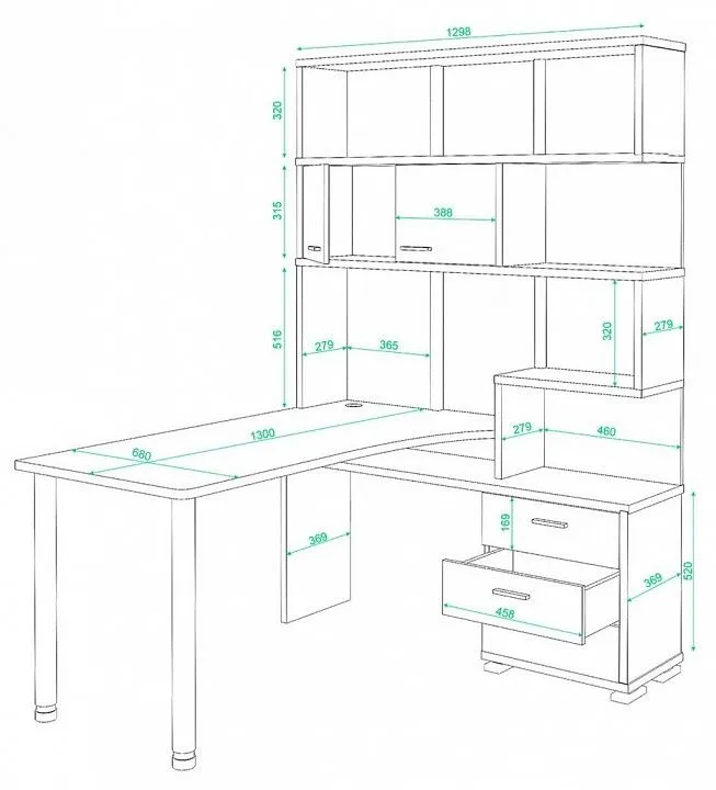 стеллаж:, 2 дверцы, 3 ящика, 4 полки