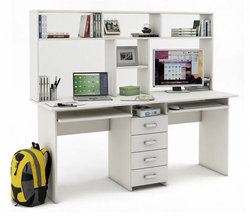надстройка: 2 полки, тумбочка: 4 ящика, 2 выдвижные панели под клавиатуру