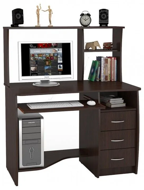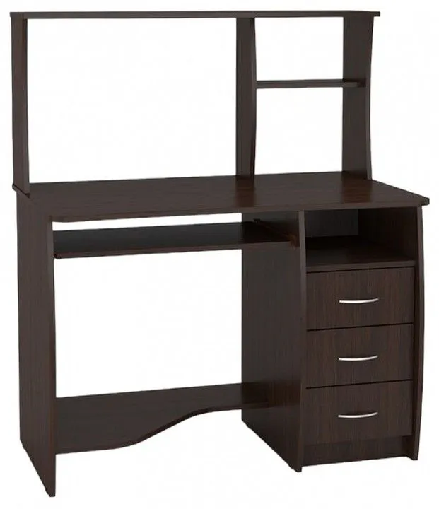 2 полки, 3 ящика, 1 ниша для системного блока, 1 выдвижная полка для клавиатуры