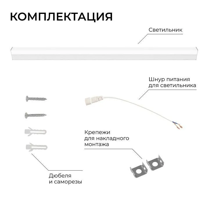 жесткий коннектор - 1 шт., дюбеля - 2 шт., саморезы - 2 шт., клипсы для накладного монтажа - 2 шт.
