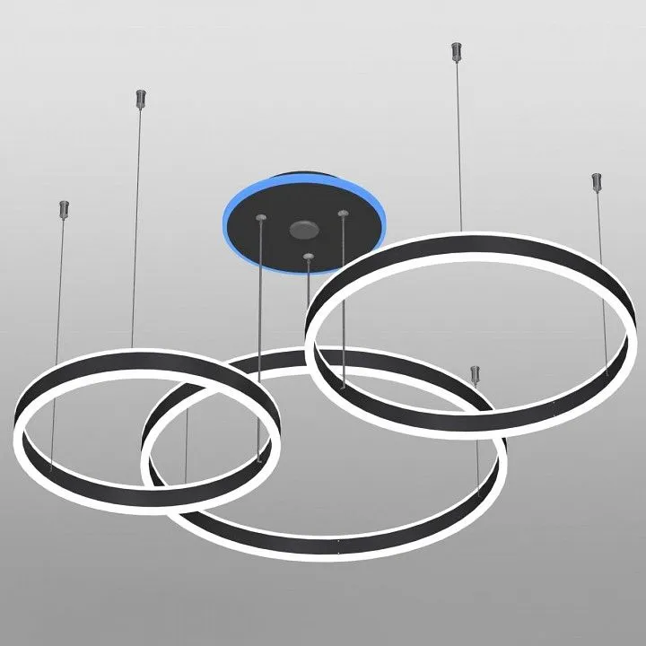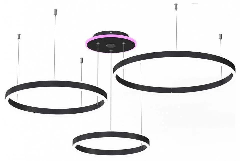 светильником можно управлять: из приложения на смартфоне по Wi-Fi при наличии интернета, с помощью голосовых помощников Алиса и Маруся, а также пультом дистанционного управления и настенным выключателем, светильник на тросах, с тремя светодиодными модулями в форме колец. Конструкция изделия позволяет при монтаже установить кольца на разной высоте и на разном удалении от базы, сформировав свой индивидуальный, неповторимый внешний вид светильника