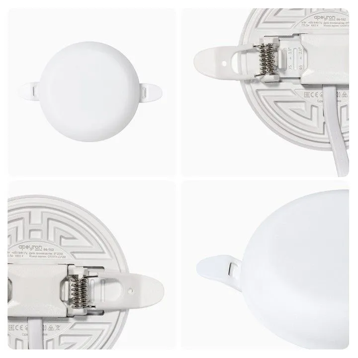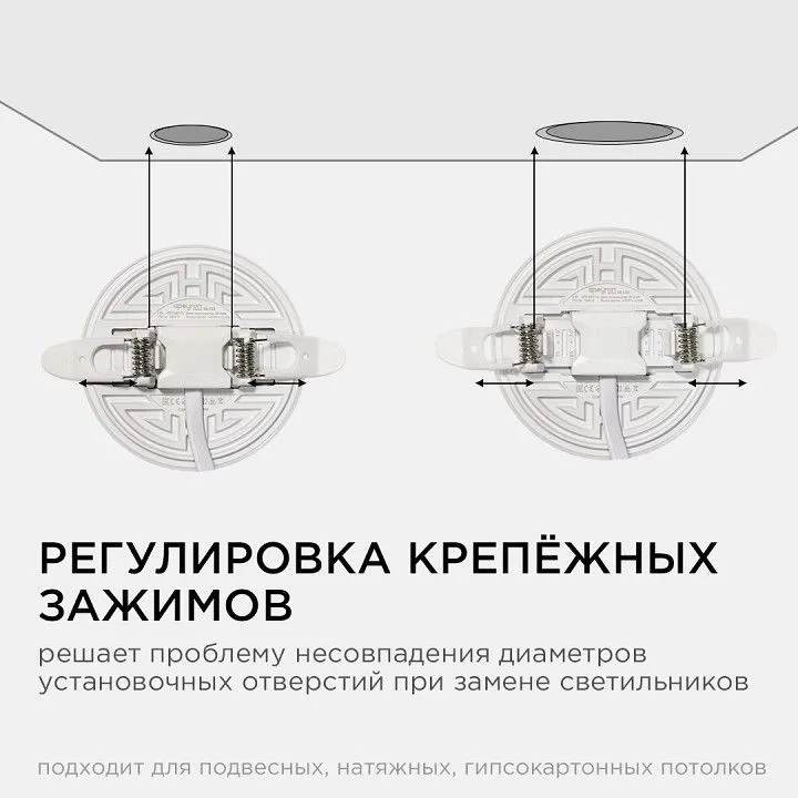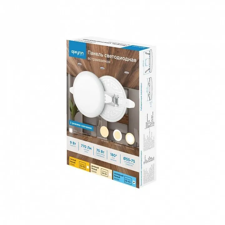 Особенностью данного изделия является 3-х ступенчатая регулировка уровня освещенности путем нажатия клавиши выключателя:, освещение всей поверхности плафона, угол рассеивания 180,°, концентрированное освещение внутреннего диаметра, угол рассеивания 120°, засветка торцевой части панели, эффект 'кольцевого освещения'.Вторая особенность панели – регулировка крепежных зажимов под посадочное отверстие Ø55-75 мм.