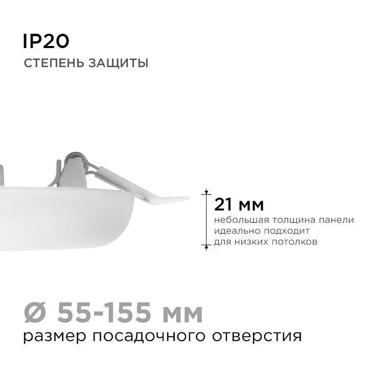 Особенностью данного изделия является 3-х ступенчатая регулировка уровня освещенности путем нажатия клавиши выключателя:, освещение всей поверхности плафона, угол рассеивания 180°, концентрированное освещение внутреннего диаметра, угол рассеивания 120°, засветка торцевой части панели, эффект 'кольцевого освещения'.Вторая особенность панели – регулировка крепежных зажимов под посадочное отверстие Ø55-155 мм.