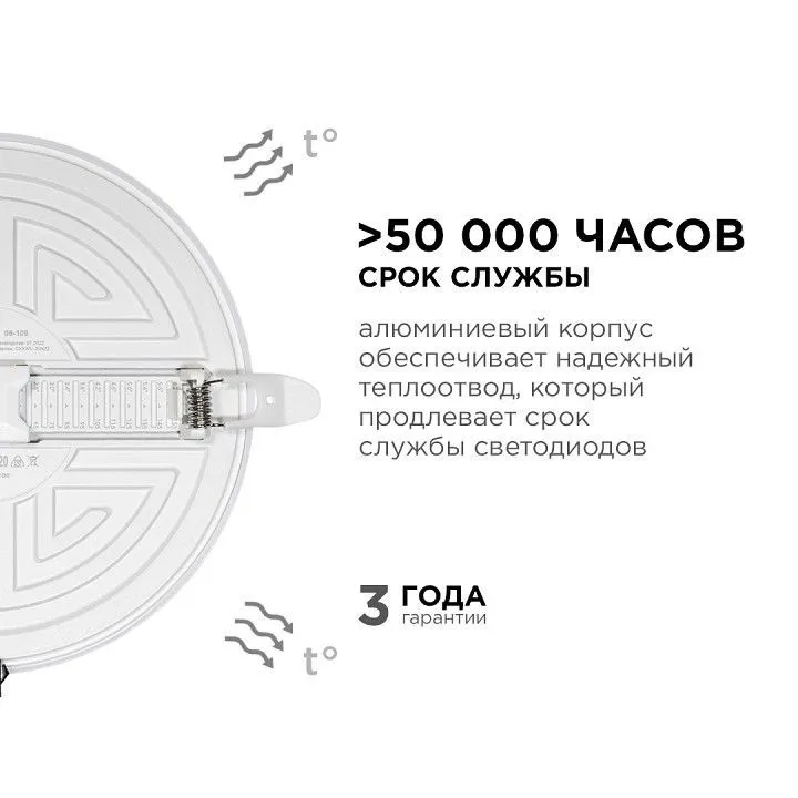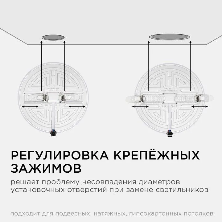 Особенностью данного изделия является 3-х ступенчатая регулировка уровня освещенности путем нажатия клавиши выключателя:, освещение всей поверхности плафона, угол рассеивания 180°, концентрированное освещение внутреннего диаметра, угол рассеивания 120°, засветка торцевой части панели, эффект 'кольцевого освещения'.Вторая особенность панели – регулировка крепежных зажимов под посадочное отверстие Ø55-155 мм.
