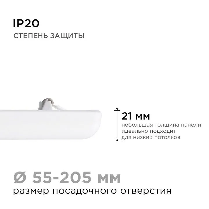 Особенностью данного изделия является 3-х ступенчатая регулировка уровня освещенности путем нажатия клавиши выключателя:, освещение всей поверхности плафона, угол рассеивания 180°, концентрированное освещение внутреннего диаметра, угол рассеивания 120°, засветка торцевой части панели, эффект 'кольцевого освещения'.Вторая особенность панели – регулировка крепежных зажимов под посадочное отверстие Ø55-205 мм.