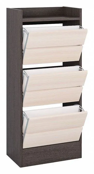 На верхней крышке предусмотрен бортик, чтобы исключить падение предметов. Имеет 3 откидных секции, в каждой возможно разместить обувь в два ряда. Ориентировочно поместится 18-20 пар обуви.